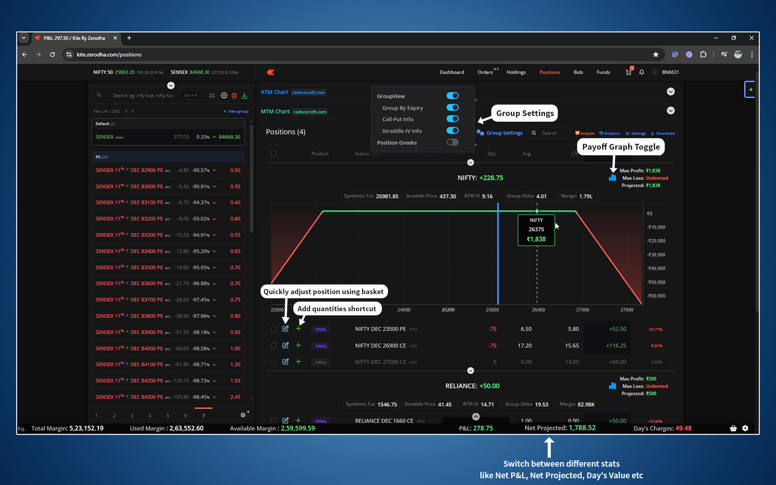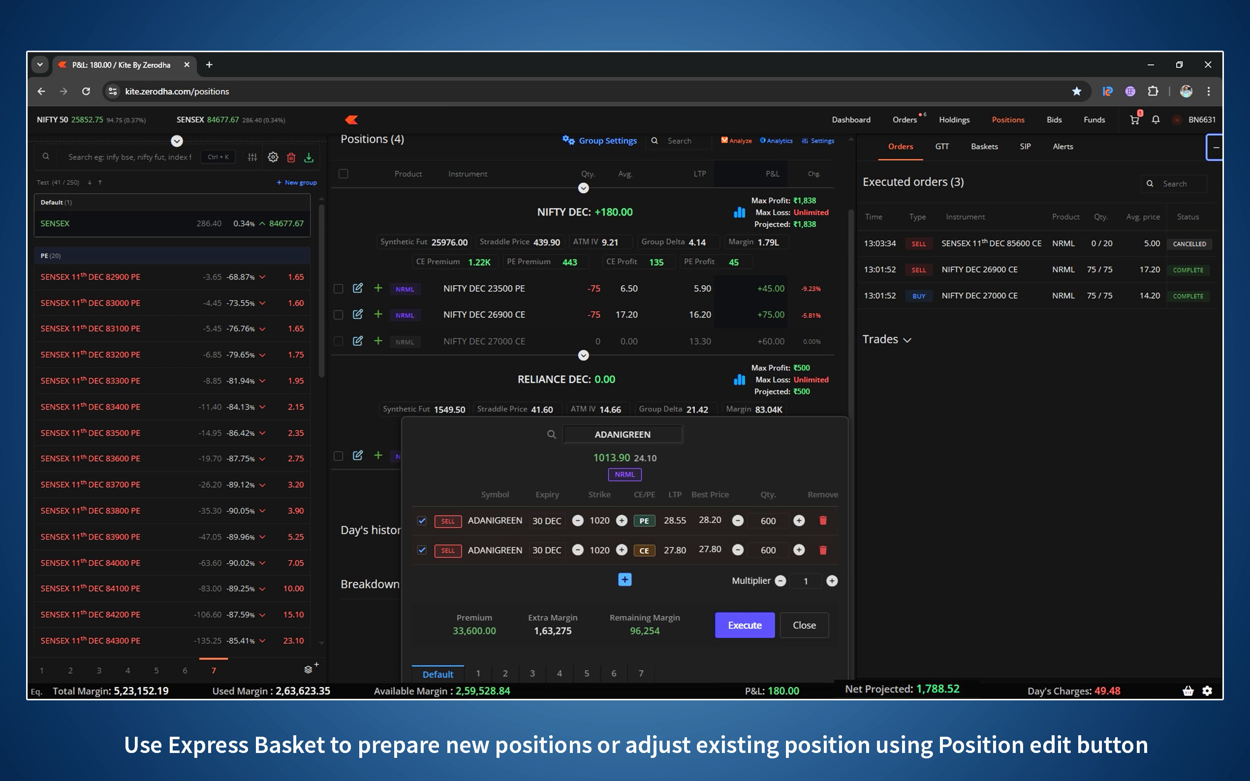 - KitePlus Express Basket auto-opens with required orders, just pick the new strike and execute.